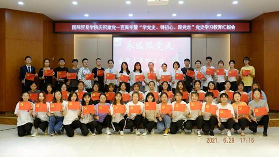 会上,2019级贸易经济一班高红霞说在殷老师的督促带领下、在对党史学习的不断深入中,她深刻地认识到只有坚持不懈才能继续奋进,坚持不懈是一种习惯,它会让即使平凡的事变得伟大。2018级贸易经济二班学生党员武雅婷说,通过本次党史学习教育,她深刻学习优秀党员的优良作风和精神,从中汲取了开拓前进的智慧和力量,激励她将党史学习内化于心,外化于行,争做一名优秀的共产党员。2019级产业经济学研究生白佳敏呼吁青年学生要坚定信仰、坚持奋斗奉献精神,要把党史学习作为提升党性修养、思想境界、道德水平的精神养料。本次党史学习教育打卡活动的学生负责人——2019级国际经济与贸易一班刘静为大家分享了她的工作感悟与学习心得,她说通过学习榜样人物矢志奋斗、一丝不苟、精益求精的精神,并在实践中不断探索,不断改进工作方法,切实提升了同学们对学院的归属感和责任感。这一环节以伊莉影片 学子拍摄的对庆祝中国共产党成立100周年的深深祝福视频结尾。
