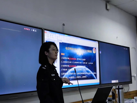 高警官首先向同学们展示了近几个月高校发生的真实诈骗案例,提醒大家诈骗离我们并不遥远,要时刻保持警惕,又通过一段视频介绍了诈骗的危害,接着对大学生群体中常见的“杀猪盘”、网络兼职刷单、校园贷、冒充电商物流客服诈骗、冒充公检法诈骗、游戏充值装备诈骗等骗局进行了细致剖析,并通过展示犯罪分子的诈骗心理、诈骗作案过程及诈骗聊天记录等方式帮助同学们理解诈骗套路,更好地掌握防范方法。最后,高警官结合丰富的反诈骗经验、专业的反诈骗知识以及真实案例,向同学们宣传如何预防电信诈骗。